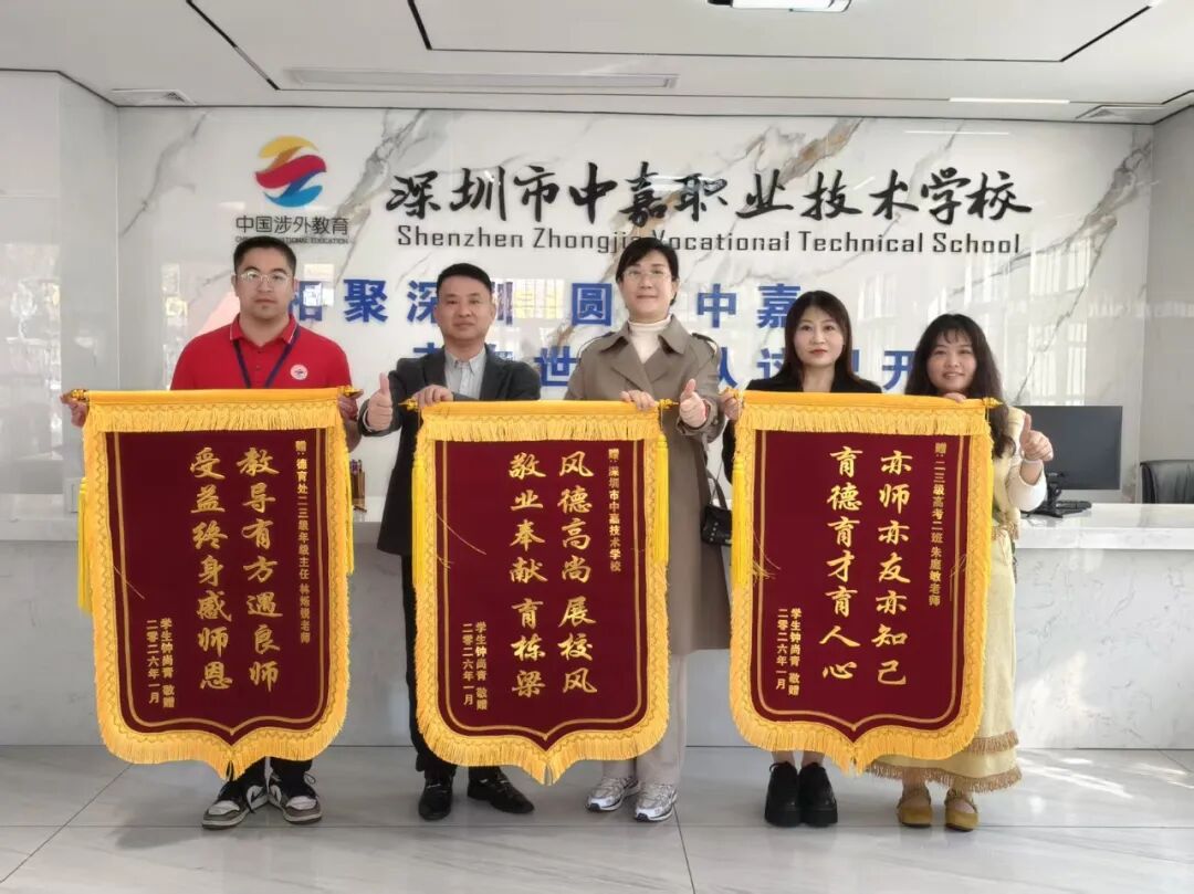 中嘉良师暖学子</h1>学校同心铸佳绩</h1>一面锦旗,一份认可;四面锦旗,满含深情。近日,深圳市中嘉职业技术学校2023级春季高考学子及家长代表,怀着诚挚的感激之情专程返校,将四面镌刻着谢意的锦旗分别赠予班主任...