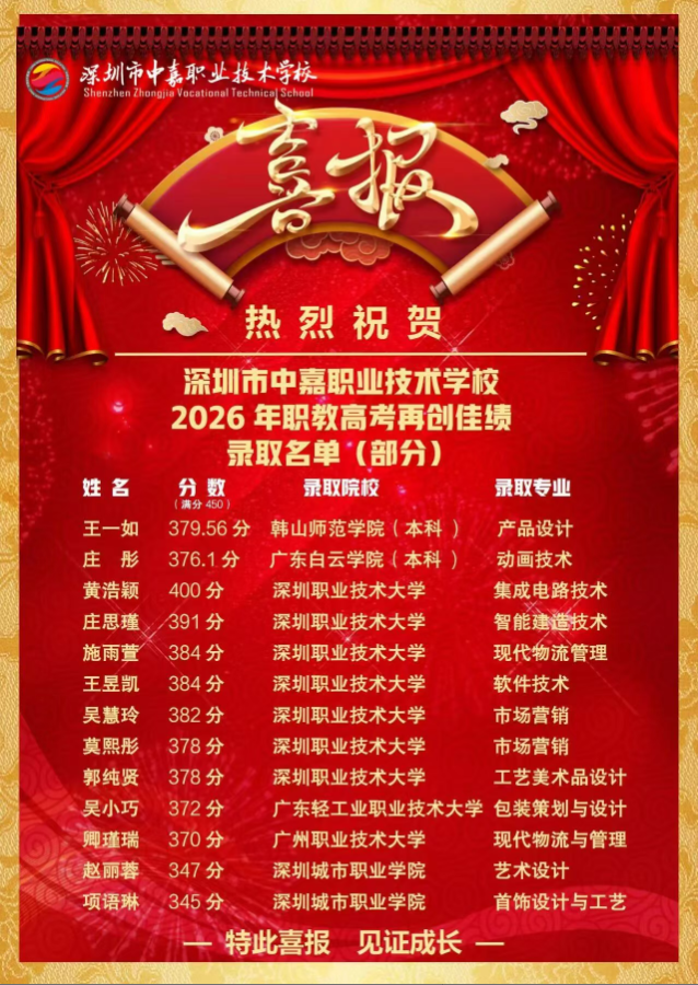 以梦为马不负韶华中嘉·高考繁星专访系列①我校王一如同学圆梦韩山师范本科!星光不负赶路人!祝贺我校王一如同学被韩山师范学院本科专业录取!在2026年广东省“3+证书”春季高考中,我校学子奋勇拼搏、再创佳绩!王...